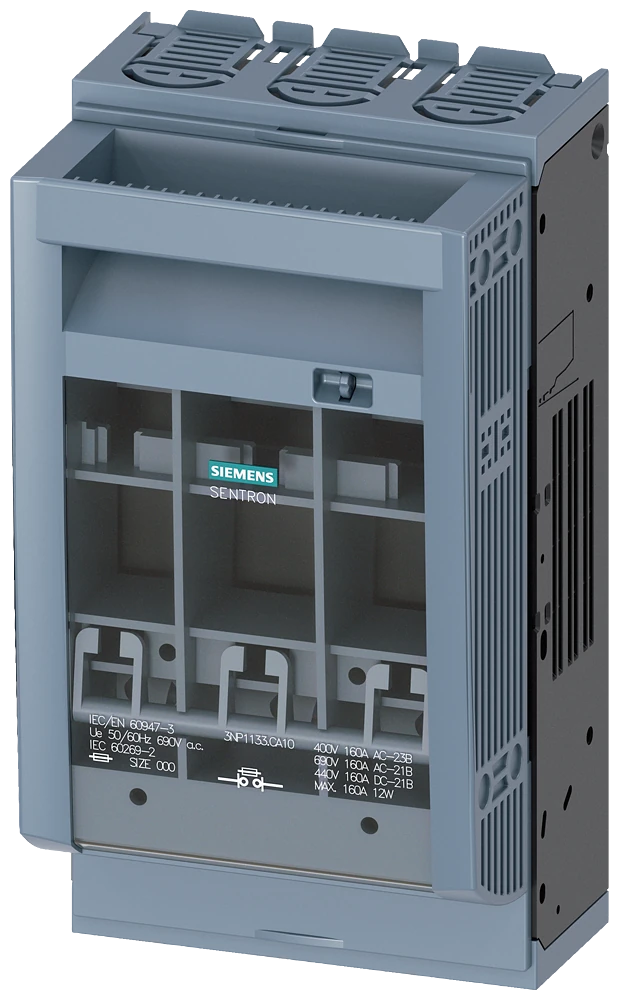 3NP1133-1CA10 Siemens SENTRON, Interrupteur-sectionneur à fusibles 3NP1, 3 pôles, NH00, 160 A, pour montage et installation sur plaque de montage, borne plate, niveau de recouvrement 45 mm