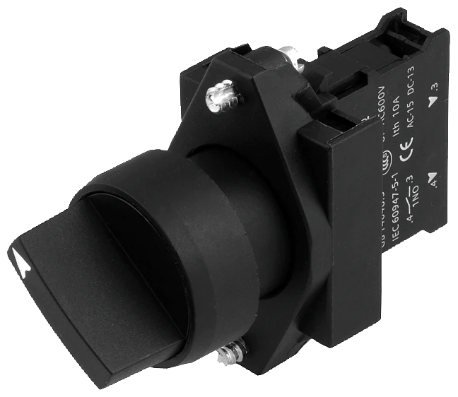 Complete unit combination 22 mm plastic black round selector switch 3 switch positions L-C-R 2X60DEG, V position latching non-illuminated with holder screw terminal, 2 NO black